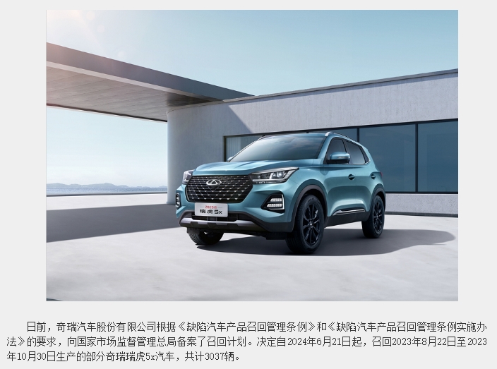 據(jù)國家市場監(jiān)督管理總局缺陷產(chǎn)品召回技術(shù)中心消息,日前,奇瑞汽車股份有限公司根據(jù)《缺陷汽車產(chǎn)品召回管理?xiàng)l例》和《缺陷汽車產(chǎn)品召回管理?xiàng)l例實(shí)施辦法》的要求,向國家市場監(jiān)督管理總局備案了召回計(jì)劃。決定自2024年6月21日起,召回2023年8月22日至2023年10月30日生產(chǎn)的部分奇瑞瑞虎5x汽車,共計(jì)3037輛。