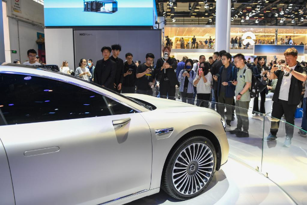 2024年4月25日,在北京中國(guó)國(guó)際展覽中心順義館舉行的2024北京車展上,參觀者在參觀享界S9汽車。新華社記者鞠煥宗 攝