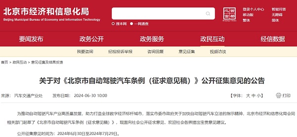 中國經(jīng)濟網(wǎng)7月2日訊(記者 姜智文)6月30日,北京市經(jīng)濟和信息化局發(fā)布《北京市自動駕駛汽車條例(征求意見稿)》(以下簡稱“征求意見稿”)提出,支持自動駕駛汽車用于城市公共電汽車客運、出租汽車客運(網(wǎng)約車)、汽車租賃等城市出行服務(wù)。