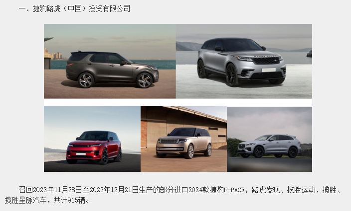 據(jù)國(guó)家市場(chǎng)監(jiān)督管理總局缺陷產(chǎn)品召回技術(shù)中心消息,日前,捷豹路虎(中國(guó))投資有限公司、捷豹路虎(寧波)貿(mào)易有限公司根據(jù)《缺陷汽車產(chǎn)品召回管理?xiàng)l例》和《缺陷汽車產(chǎn)品召回管理?xiàng)l例實(shí)施辦法》的要求,向國(guó)家市場(chǎng)監(jiān)督管理總局備案了召回計(jì)劃,自2024年6月26日起,捷豹路虎(中國(guó))投資有限公司召回2023年11月28日至2023年12月21日生產(chǎn)的部分進(jìn)口2024款捷豹F-PACE,路虎發(fā)現(xiàn)、攬勝運(yùn)動(dòng)、攬勝、攬勝星脈汽車,共計(jì)915輛。捷豹路虎(寧波)貿(mào)易有限公司召回2023年11月30日至2024年1月31日生產(chǎn)的部分進(jìn)口2024款路虎衛(wèi)士汽車,共計(jì)854輛。