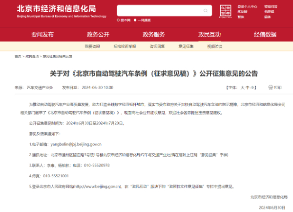 據(jù)北京市經(jīng)濟(jì)和信息化局網(wǎng)站6月30日消息,為推動(dòng)自動(dòng)駕駛汽車產(chǎn)業(yè)高質(zhì)量發(fā)展,助力打造全球數(shù)字經(jīng)濟(jì)標(biāo)桿城市,落實(shí)北京市委市政府關(guān)于加快自動(dòng)駕駛汽車立法的指示精神,該局會(huì)同相關(guān)部門起草了《北京市自動(dòng)駕駛汽車條例(征求意見稿)》(以下簡(jiǎn)稱《征求意見稿》)并面向社會(huì)各界公開征求意見?!墩髑笠庖姼濉分刑岢?,支持自動(dòng)駕駛汽車用于城市公共電汽車客運(yùn)、出租汽車客運(yùn)(網(wǎng)約車)、汽車租賃等城市出行服務(wù)。